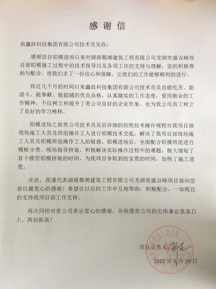 5月29日,都湘建工龍湖奕盛谷峰項(xiàng)目部向鑫政集團(tuán)發(fā)來感謝信,高度贊揚(yáng)鑫政工程服務(wù)人員在項(xiàng)目施工過程中服務(wù)專業(yè)而周到,極大地提升了項(xiàng)目首個(gè)樓層的鋁模拼裝效率,為后續(xù)工程的優(yōu)質(zhì)高效施工打下堅(jiān)實(shí)基礎(chǔ)。